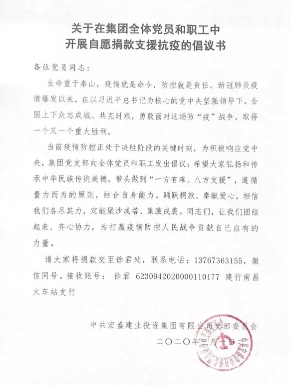“抗擊疫情當先鋒,身體力行作表率”。在疫情面前,以集團董事長周金虎、副董事長周金旺同志為代表的一大批共產(chǎn)黨員,挺身而出,力求作為,截止目前,宏盛建業(yè)已從全國和海外采購了價值340多萬元的醫(yī)療防護物資,用于無償捐贈,為上饒市、新余市、宜春市、宜賓市、巴中市、四川涼山州,上海等市轄區(qū)的相關單位抗疫出力,出資近百萬元無償援建上饒市負壓病房和醫(yī)療廢物暫存站2個抗疫項目。