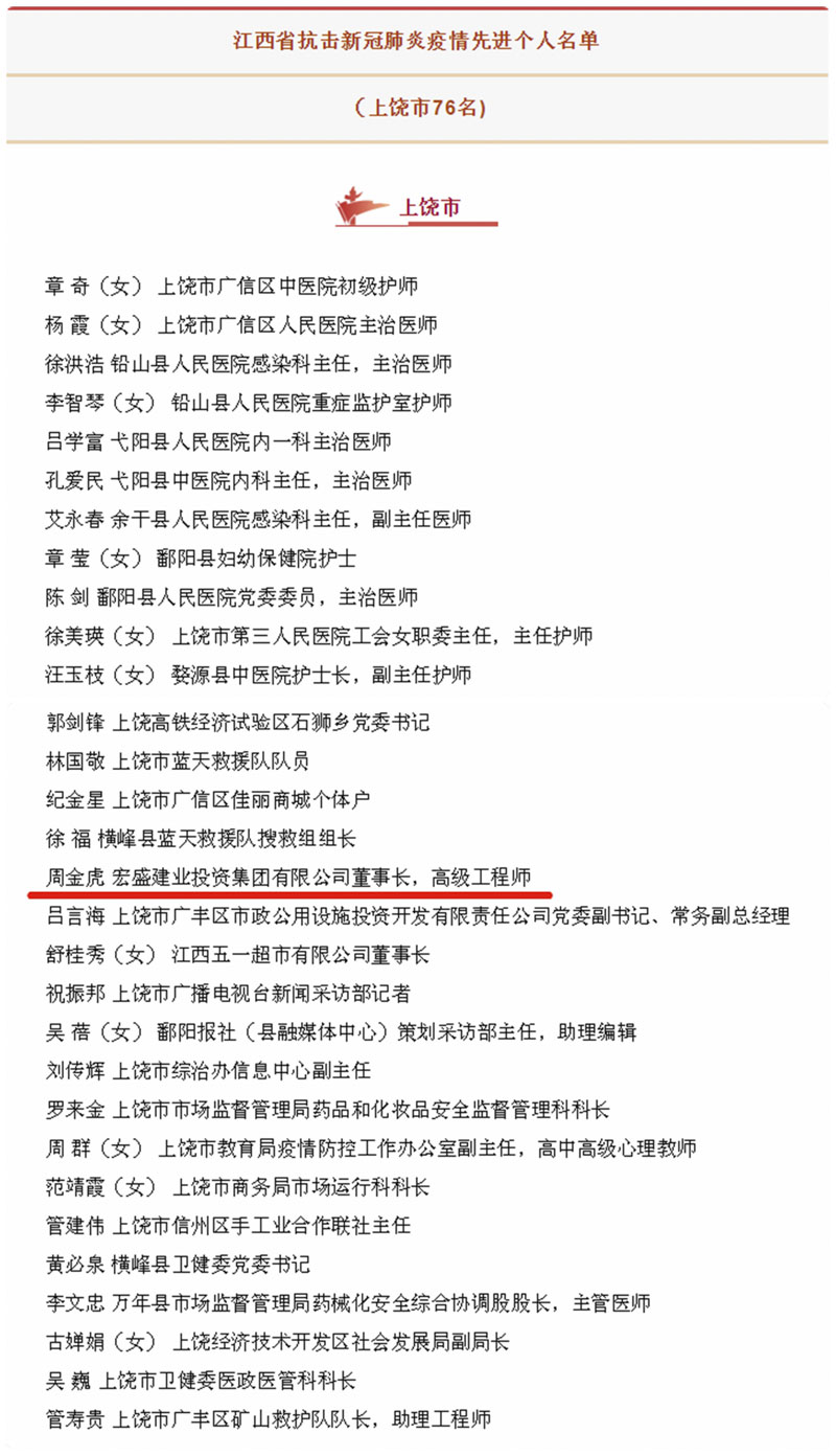 宏盛建業(yè)董事長周金虎獲評“江西省抗擊新冠肺炎疫情先進(jìn)個人”