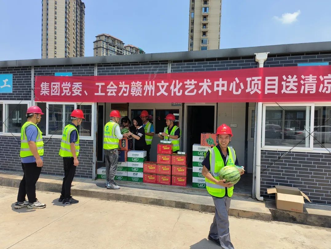 7月24日下午,集團審計中心客服主管董華燕、人力資源中心招培主管白雪赴贛州為贛州文化藝術(shù)中心項目部送清涼,為項目一線工友送去了飲料、西瓜、十滴水等防暑降溫物品,也送去了集團黨委和工會對項目一線工友的關(guān)愛。