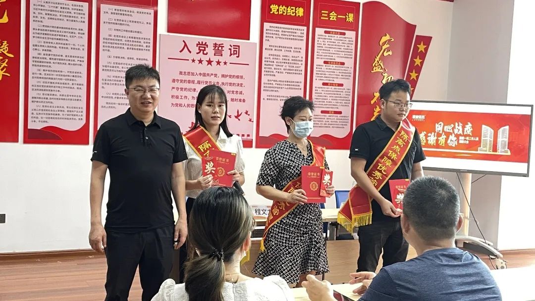 2022年7月1日上午9:30分上饒市建筑科技產(chǎn)業(yè)園抗疫一線工作人員表彰大會(huì)在建業(yè)大廈二樓黨群活動(dòng)室舉行。上饒市建筑科技產(chǎn)業(yè)園總經(jīng)理何德洪、常務(wù)副總經(jīng)理程文龍、副總經(jīng)理趙慧出席會(huì)議,為疫情期間,堅(jiān)守崗位、無私奉獻(xiàn)、共同抗疫的員工們頒發(fā)榮譽(yù)證書及慰問金。