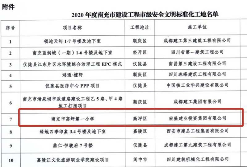 近日,從四川省南充市住房和城鄉(xiāng)建設(shè)局公布的《關(guān)于公布2020年度南充市建設(shè)工程市級安全標(biāo)準(zhǔn)化工地的通知》文件獲悉,宏盛建業(yè)投資集團(tuán)“南充市高坪第一小學(xué)”建設(shè)項目獲評“2020年度南充市建設(shè)工程市級安全文明標(biāo)準(zhǔn)化工地”。