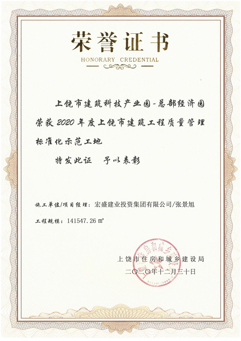 上饒市建筑科技產(chǎn)業(yè)園-總部經(jīng)濟(jì)園項目榮獲“2020年度上饒市建筑工程質(zhì)量管理標(biāo)準(zhǔn)化示范工地”。