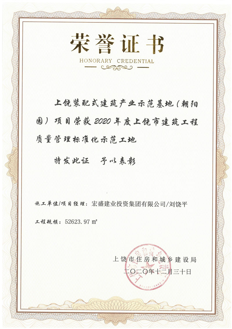 上饒裝配式建筑產(chǎn)業(yè)示范基地(朝陽園)項目榮獲“2020年度上饒市建筑工程質(zhì)量管理標(biāo)準(zhǔn)化示范工地”。