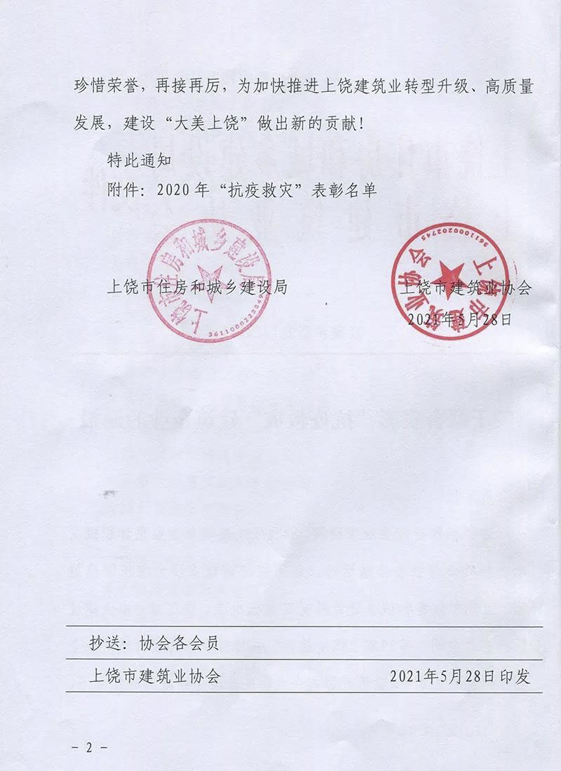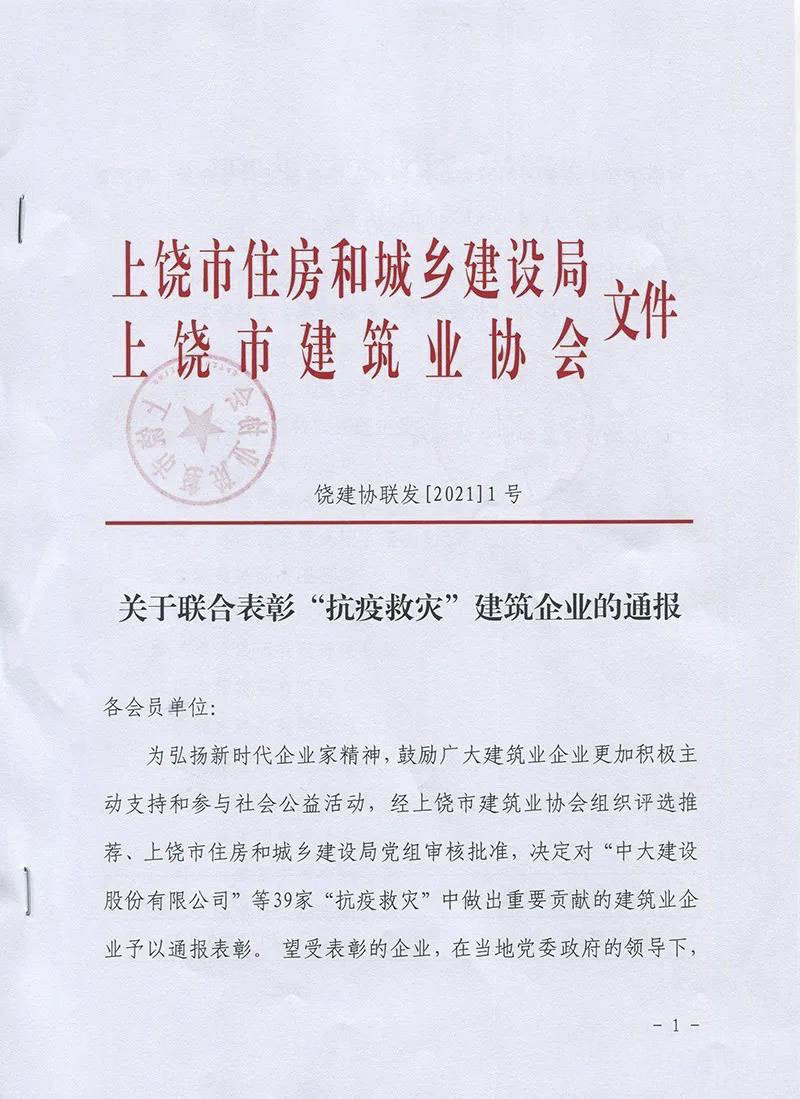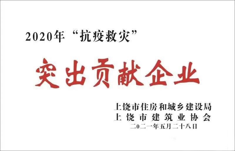 近日,經(jīng)上饒市建筑業(yè)協(xié)會組織評選推薦、上饒市住房和城鄉(xiāng)建設(shè)局黨組審核批準(zhǔn),對“抗疫救災(zāi)“中作出重要貢獻的建筑企業(yè)予以通報表彰。集團獲評“2020年抗疫救災(zāi)突出貢獻企業(yè)“!