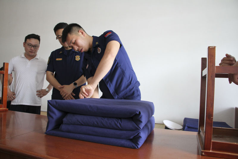 培訓(xùn)結(jié)束后,喬副站長又帶著我們參觀了整個(gè)救援站,讓我們親自試穿了一下防火戰(zhàn)斗服,并結(jié)合接警出動(dòng)到滅火救援的全過程進(jìn)行了細(xì)致的講解,參觀內(nèi)務(wù)時(shí),還給我們展示了一個(gè)“豆腐塊”軍被是如何疊出來的。一整個(gè)下午的時(shí)間,讓全體人員對(duì)消防基本知識(shí)和滅火技能有了更加全面的認(rèn)識(shí)。