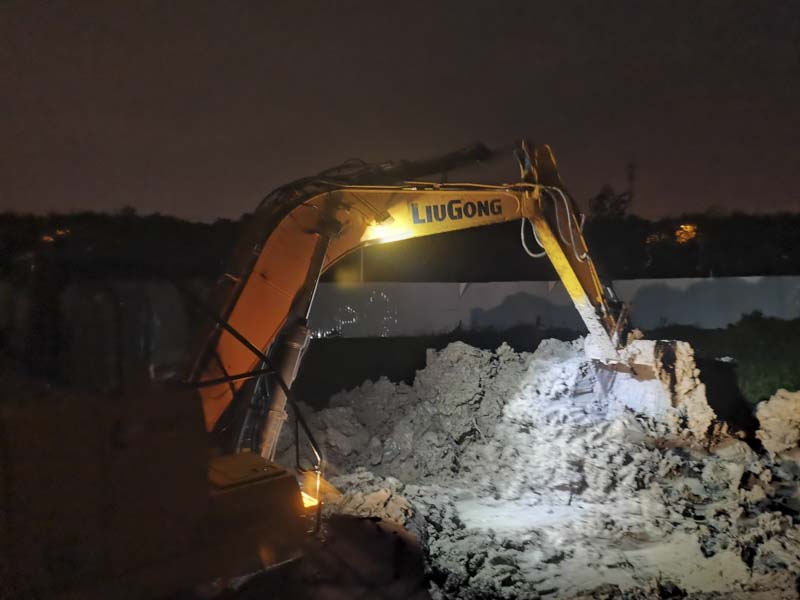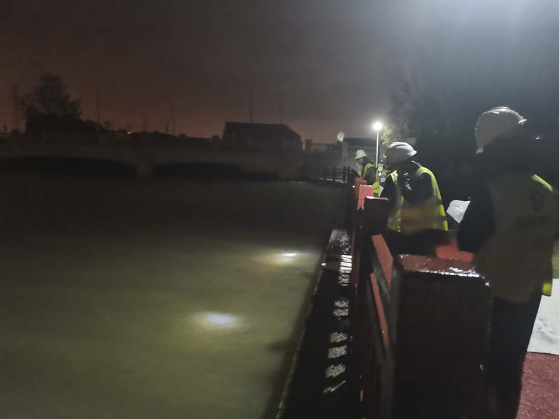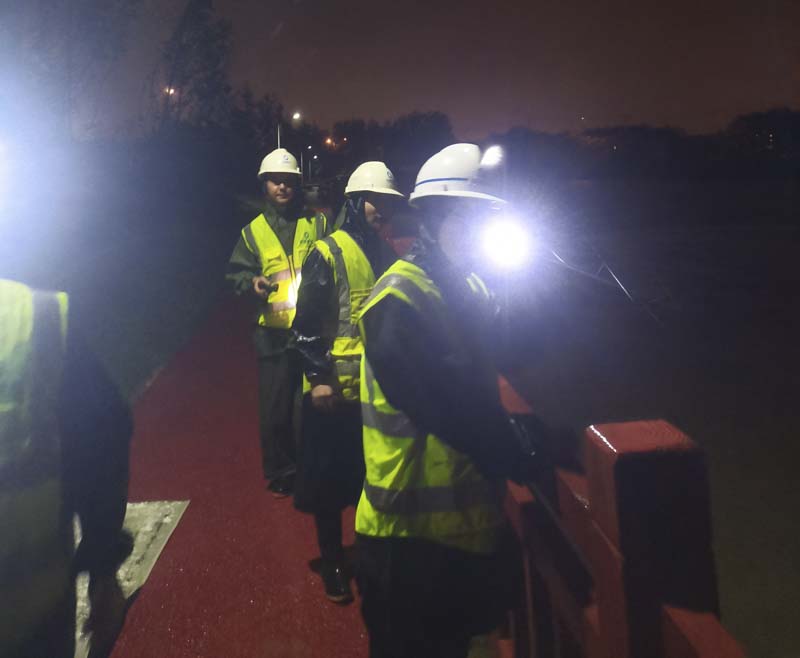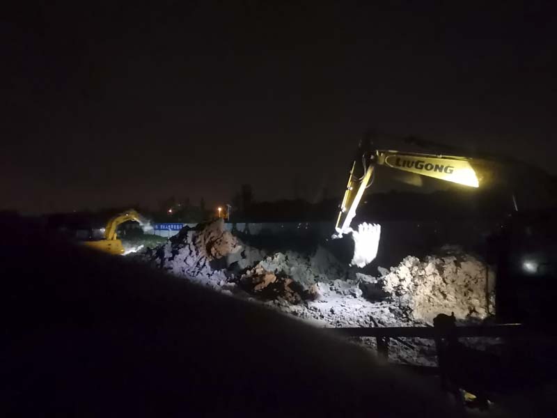 由于臨河水位的不斷上升,避免漲水淹沒我司做的地下工程,立馬調(diào)來(lái)三臺(tái)挖掘機(jī)和兩臺(tái)渣土車連夜工作,現(xiàn)場(chǎng)挖土加高項(xiàng)目南側(cè)的路面?,F(xiàn)場(chǎng)狂風(fēng)暴雨,搶險(xiǎn)支援隊(duì)的同事始終站在大雨中一絲不茍地指揮著。