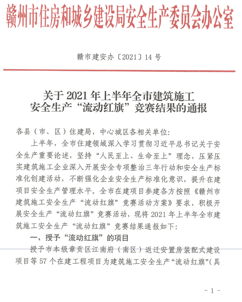 落實安全責任,推動安全發(fā)展。宏盛建業(yè)秉著鑄精品工程,創(chuàng)美好生活的核心價值觀,同時在集團內(nèi)部不斷開展多種形式的安全生產(chǎn)活動,提高集團整體安全生產(chǎn)管理水平。近日,從贛市建安辦文件[2021]14號文件《關(guān)于2021年上半年全市建筑施工安全生產(chǎn)“流動紅旗”競賽結(jié)果的通報》獲悉,集團建設(shè)項目贛州經(jīng)開區(qū)文化藝術(shù)中心建設(shè)項目(A、C地塊)榮獲贛州市2021年上半年建筑施工安全生產(chǎn)“流動紅旗”獎項。